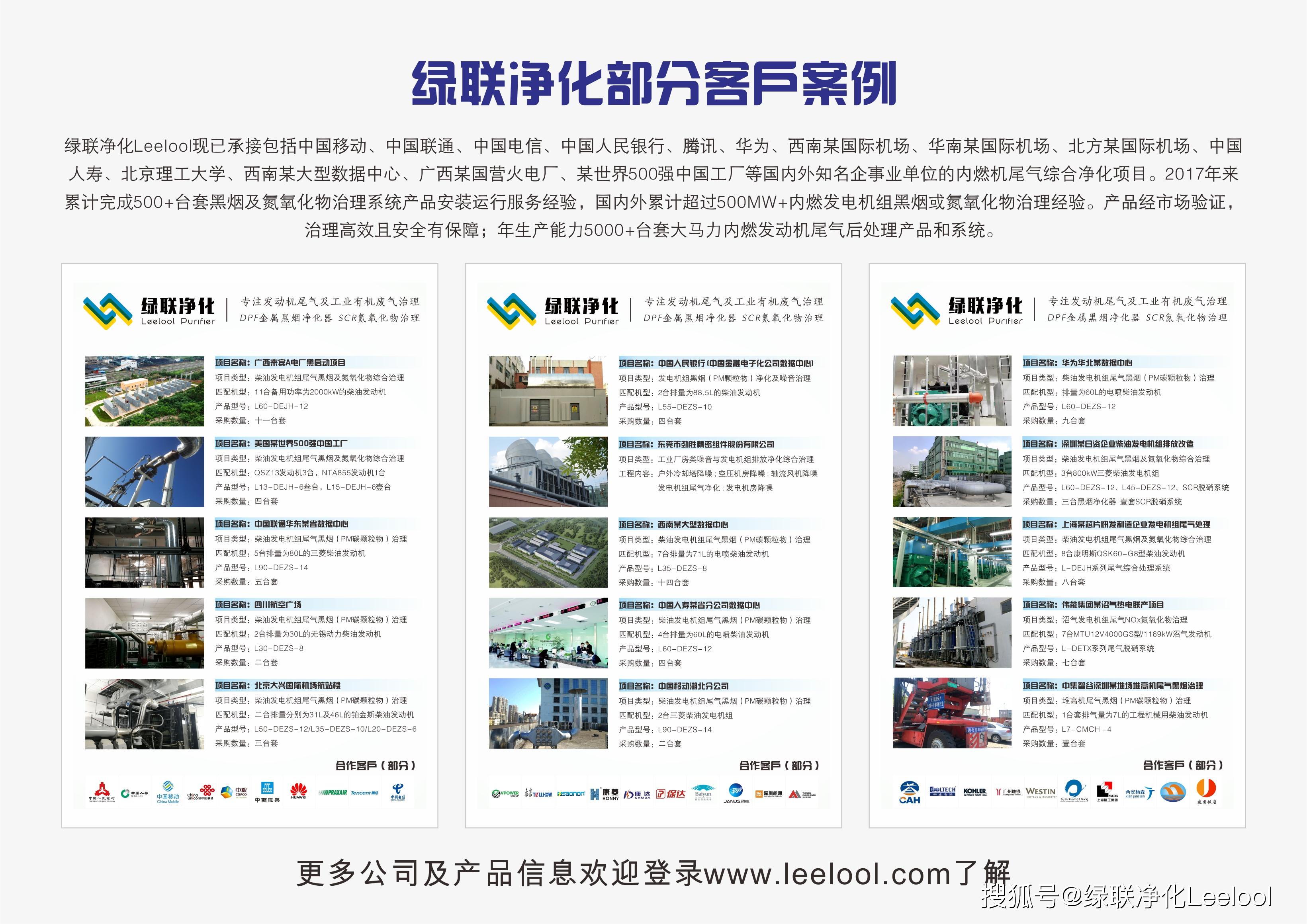 綠聯凈化Leelool現已承接包括中國移動、中國聯通、中國電信、中國人民銀行、騰訊、華為、西南某國際機場、華南某國際機場、北方某國際機場、中國人壽、北京理工大學、西南某大型數據中心、廣西某國營火電廠、某世界500強中國工廠等國內外知名企事業單位的內燃機尾氣綜合凈化項目。2017年來累計完成500+臺套黑煙及氮氧化物治理系統產品安裝運行服務經驗,國內外累計超過500MW+內燃發電機組黑煙或氮氧化物治理經驗。產品經市場驗證,治理高效且安全有保障;年生產能力5000+臺套大馬力內燃發動機尾氣后處理產品和系統。